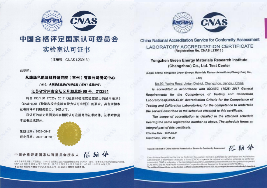 August 21 – The Testing Center of YONZ Green Energy Materials Research Institute (Changzhou) Co., Ltd. has been awarded CNAS accreditation (Certificate No.: CNAS L23913) by the China National Accreditation Service for Conformity Assessment. This milestone achievement marks official recognition of the center’s technical competence and quality management in aluminum alloy material testing, elevating it to the status of a nationally accredited laboratory.